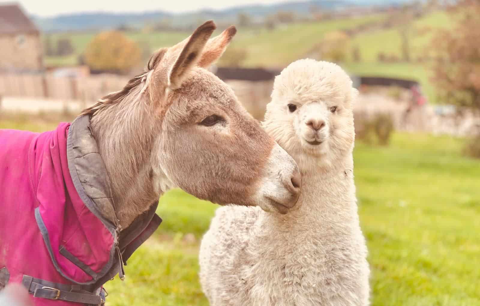 The donkey who likes to rest his head on an alpaca for a moment. It is very sweet.