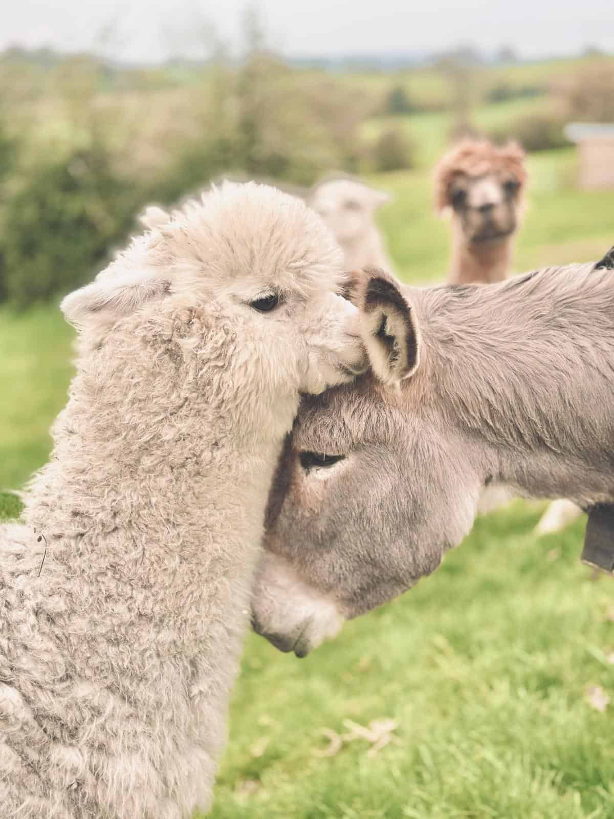 The lightest alpaca, Oscar, who adores the donkeys and often stands nose to nose with them.